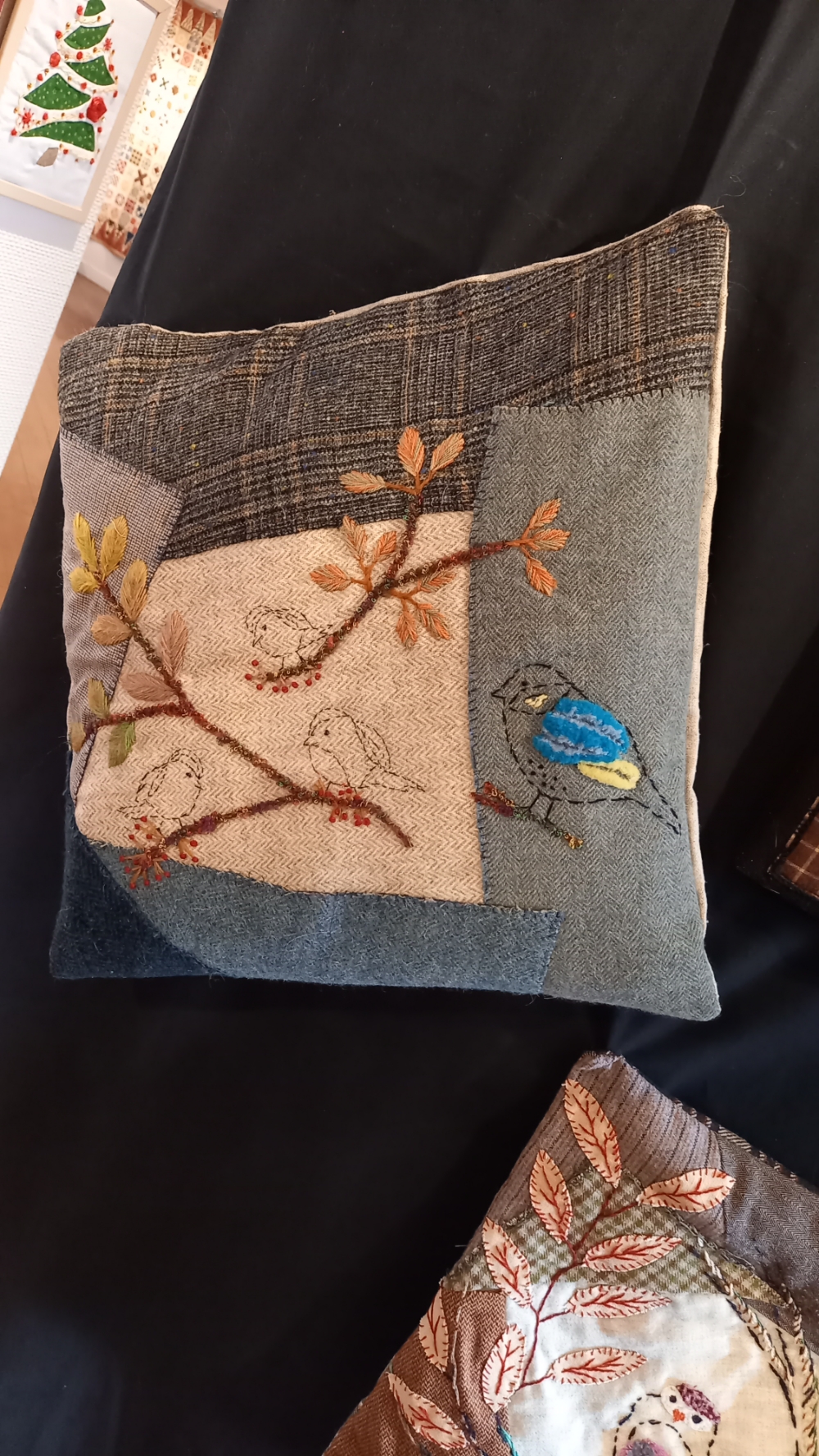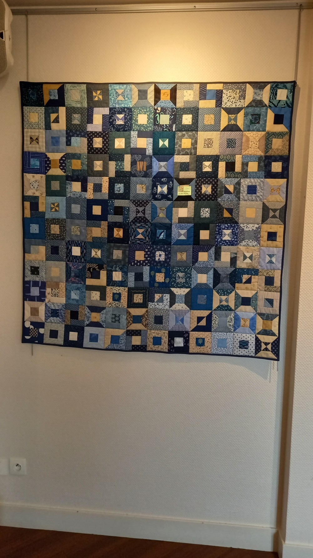 Très beau lot de la loterie !Ce quilt est l’oeuvre de Georgette… qui ne travaille qu’à la main !! Argh…. c’est quand même du paper piecing et elle a réalisé une bordure en Crasy tout autour…. elle a aussi quilté elle-même son travail à la machine domestique !Je continue avec ces 2 quilts qui sont aussi l’œuvre de Georgette basée sur des photos ! Mille bravos pour ces travaux !! Quelle artiste !Un peu de SashikoWow !Observez le Trapunto dans les blocs !Top fait par le club et gagné par une membre du club ! Cette combinaison cheddar/bleu est gagnante à coup sûr !!