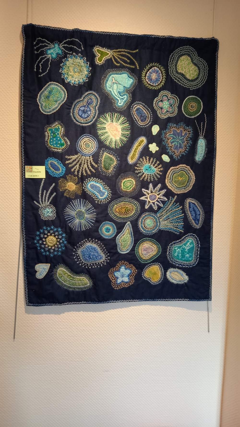 Voici quelques photos du travail du groupe « Quilt en Rêve » et de Martine Linux ! Je vous laisse admirer…. tous ces chefs-d’œuvre sont travaillés et quiltés à la main !
