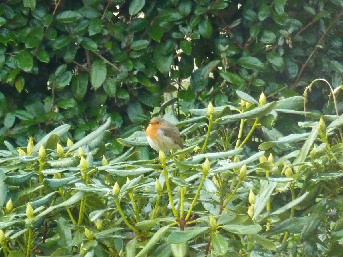 Un petit rouge-gorge est venu se poser sur le rhododendron ce matin, à côté des boules de graisse et des graines….signe que l’hiver est bien là !