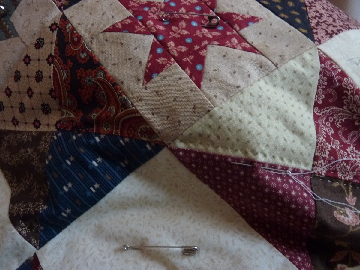 1. Je suis aussi en mode quilting et… j’aime pô ça du tout… bon j’aime pas le cercle et quand les patchs sont grands j’ai beaucoup de mal pour le milieu…. mais bon… dernière bordure d’un patch qui me tenait à coeur et qui avait été interrompu par le décès du futur (normalement..) propriétaire… Tu vois j’avance quand même, au milieu du travail et de la pneumonie/grippe du bb !